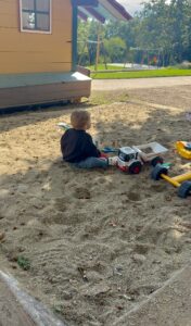 Λίγο πιο δίπλα υπάρχει ένα σκάμμα με φορτηγάκια και κουβαδάκια, ιδανικό για ατελείωτο παιχνίδι με το χώμα.