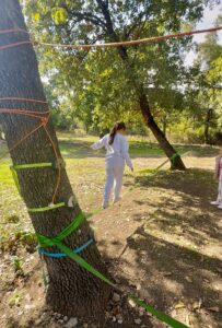 Αλλά το παιχνίδι δεν σταματάει εκει! Ανάμεσα στα δέντρα θα βρεις ιδιαίτερες κούνιες δεμένες στα κλαδιά και σχοινιά ισορροπίας που προκαλούν τη φαντασία και την αυτοπεποίθησή τους.